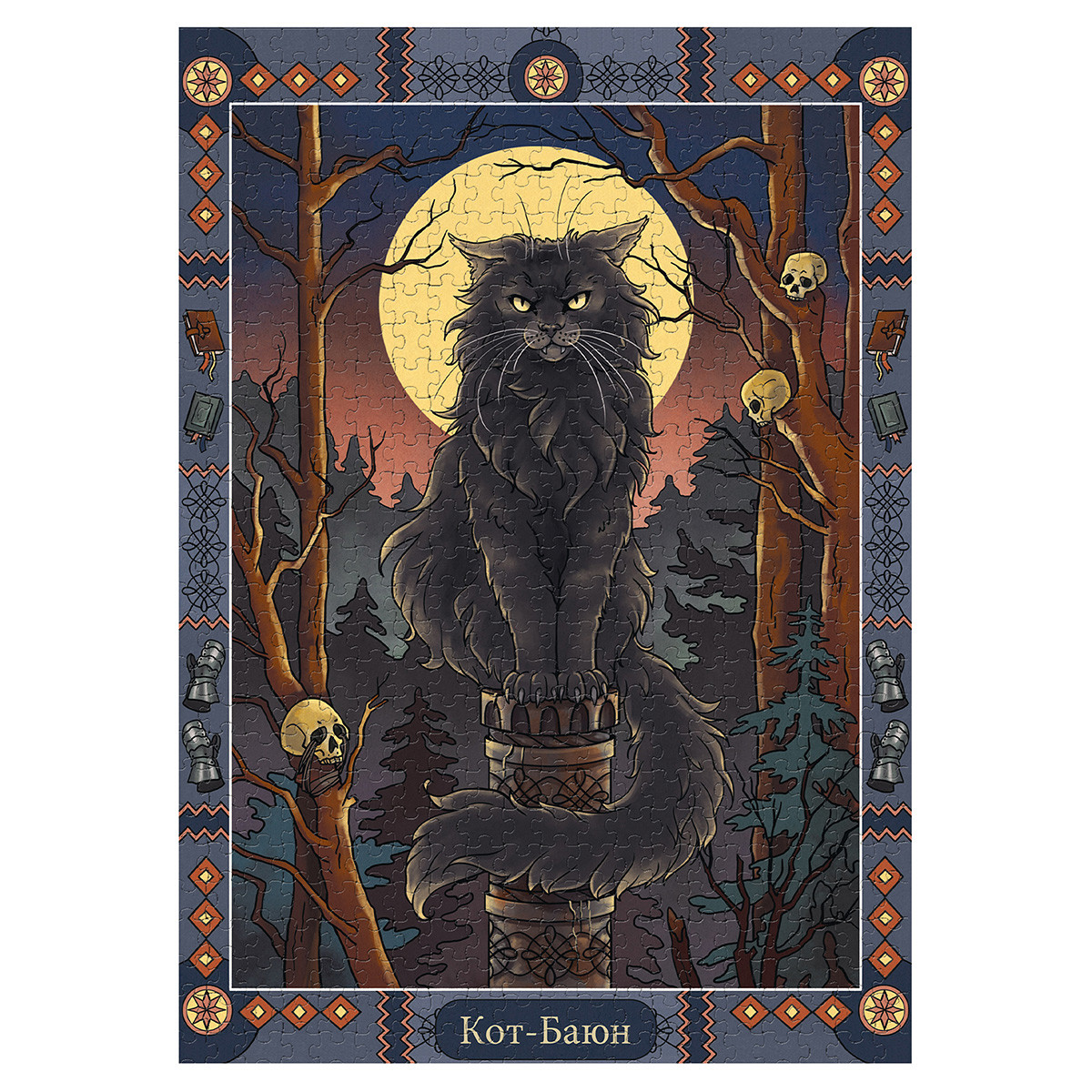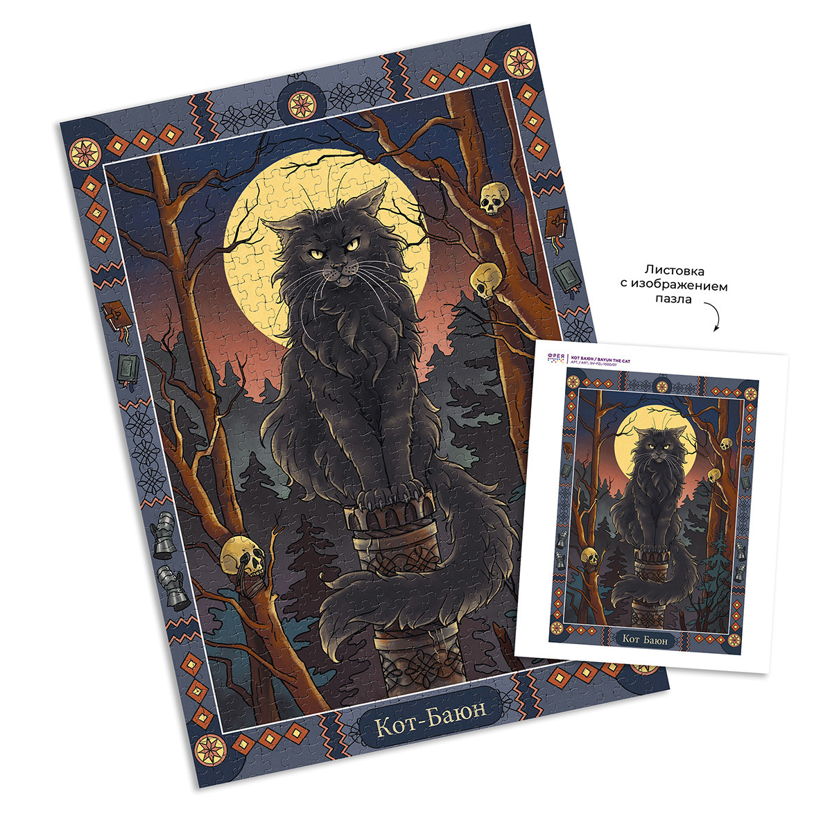 Пазлы ТМ Фрея - это яркие, интересные, увлекательные дизайны. Специально для вас мы разработали уникальную серию картин " Славянская мифология". Готовый пазл с таким сюжетом может стать интересным и необычным украшением интерьера. Также пазлы ТМ Фрея будут отличным подарком для ваших близких. Детали пазлов этой серии толще обычных. Для изготовления деталей мы используем европейский картон премиум качества. Такой картон не деформируется и не расслаивается даже при многократной сборке пазла. Размер готовой работы может отличаться от указанной на сайте. Актуальная информация размещена на упаковке товара. Кот Баюн – огромный черный кот. Он обитает на высоком железном или золотом столбев безжизненном лесу. Когда идет вниз по столбу – песни поет, поднимается вверх – сказкирассказывает. Когти у кота железные, а голос раздается на несколько верст и напускает наврагов неодолимый сон. Имя кота Баюн означает рассказчик, сказитель и происходит от глагола баять – рассказывать, говорить. Если герою сказки удается победить кота, Баюн соглашается служить ему: рассказыватьцелебные сказки, которые могут спасти от любого недуга. В ранних изданиях русских сказок котБаюн не встречается, поэтому есть мнение, что это поздний персонаж, придуманный тольков XIX веке. Кот ученый из сказки Пушкина «Руслан и Людмила» – интерпретация образа кота БаюнаСообщить о неточности в описании